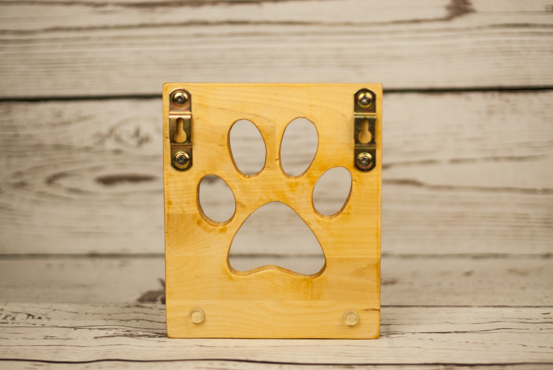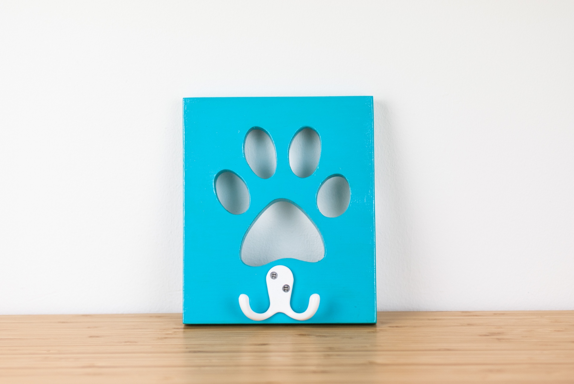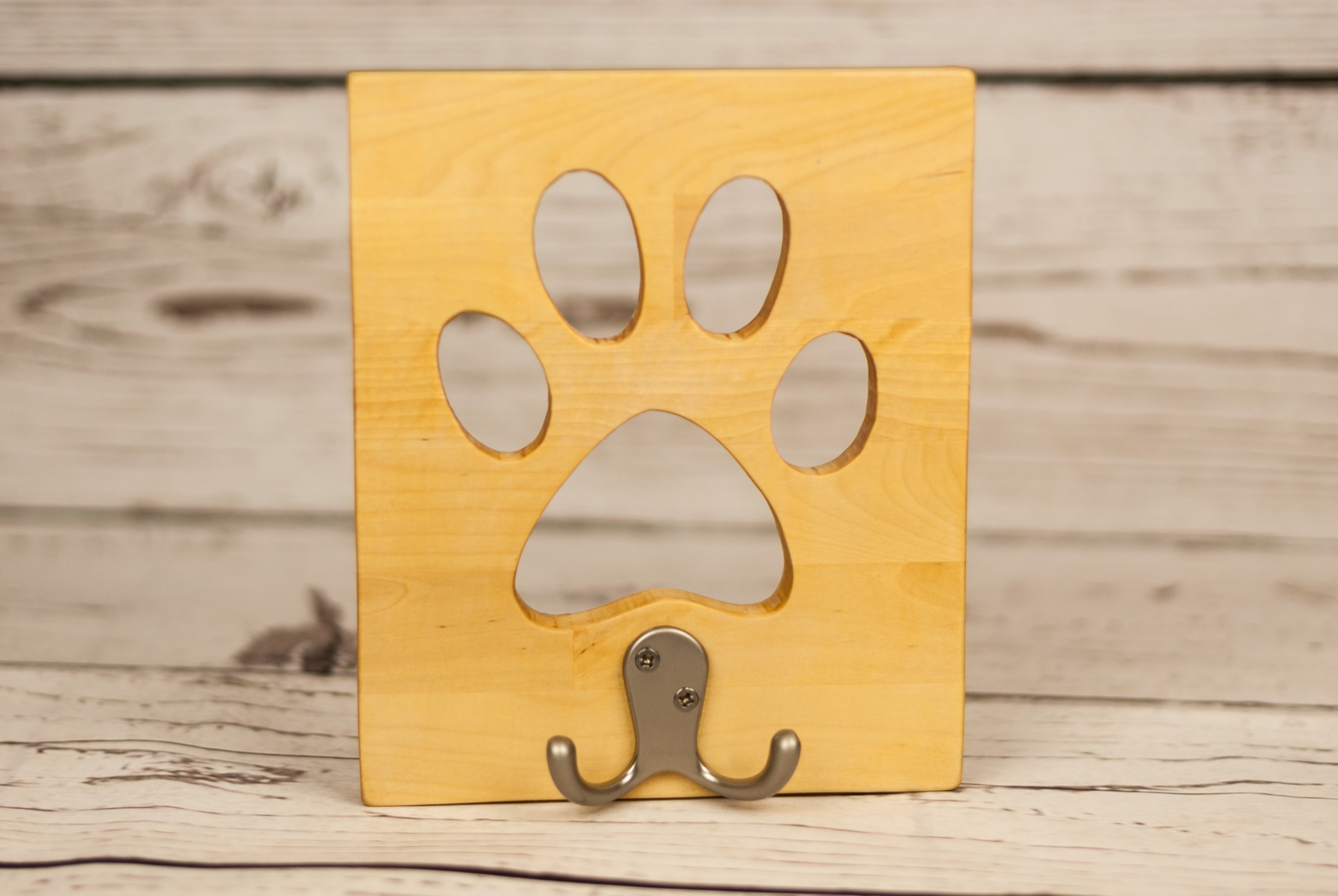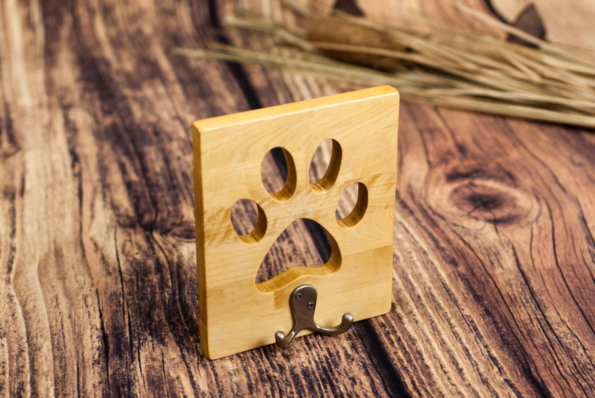Suporte de madeira clara com recorte de pata e gancho metálico