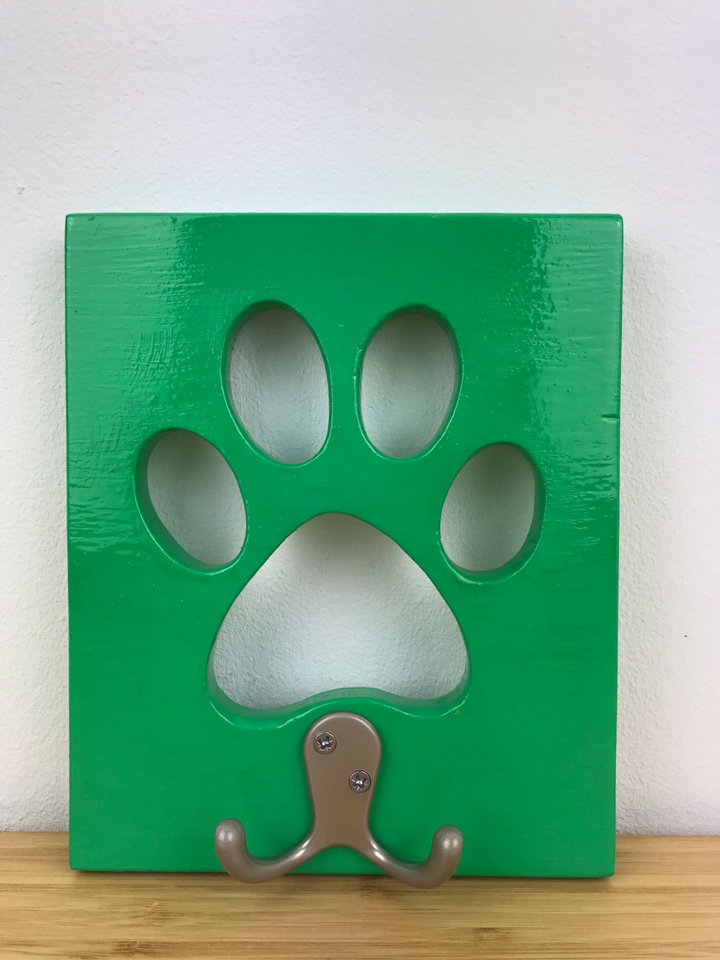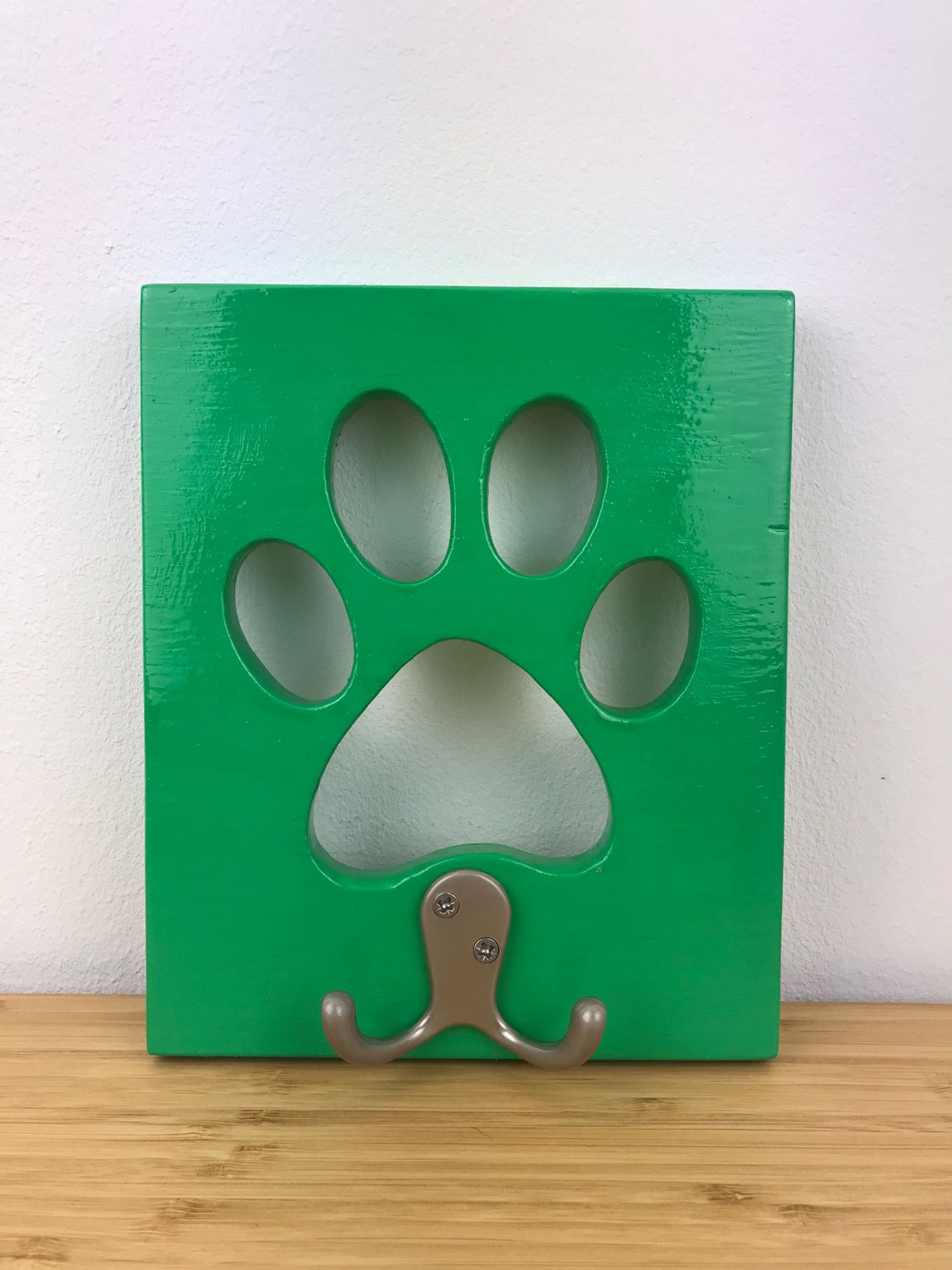 • Suporte verde de parede com recorte em forma de pata e gancho metálico