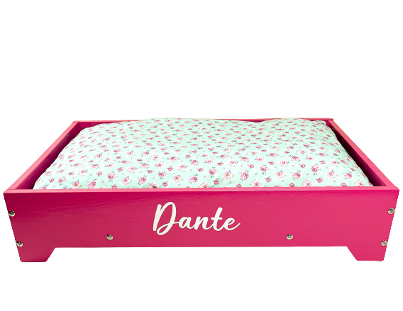 • Cama rosa para animais com almofada branca com flores rosa e verdes