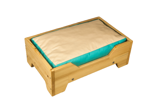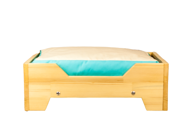 • Cama para animais em madeira clara com almofada azul turquesa e bege