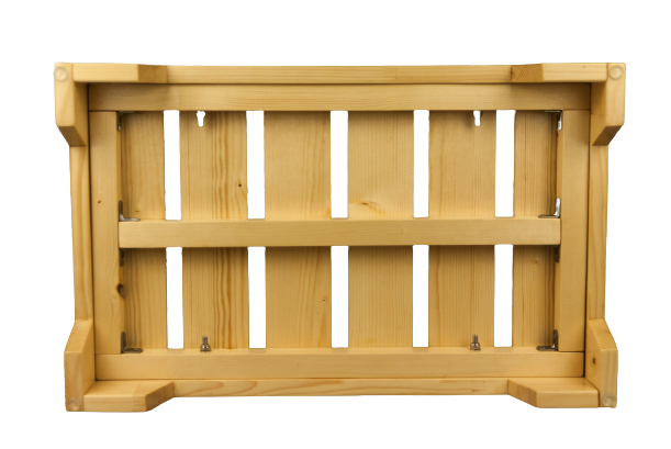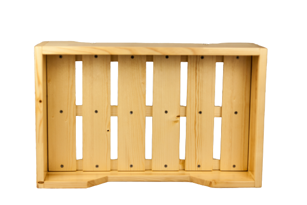 • Caixa de madeira clara com tábuas paralelas e suportes na base