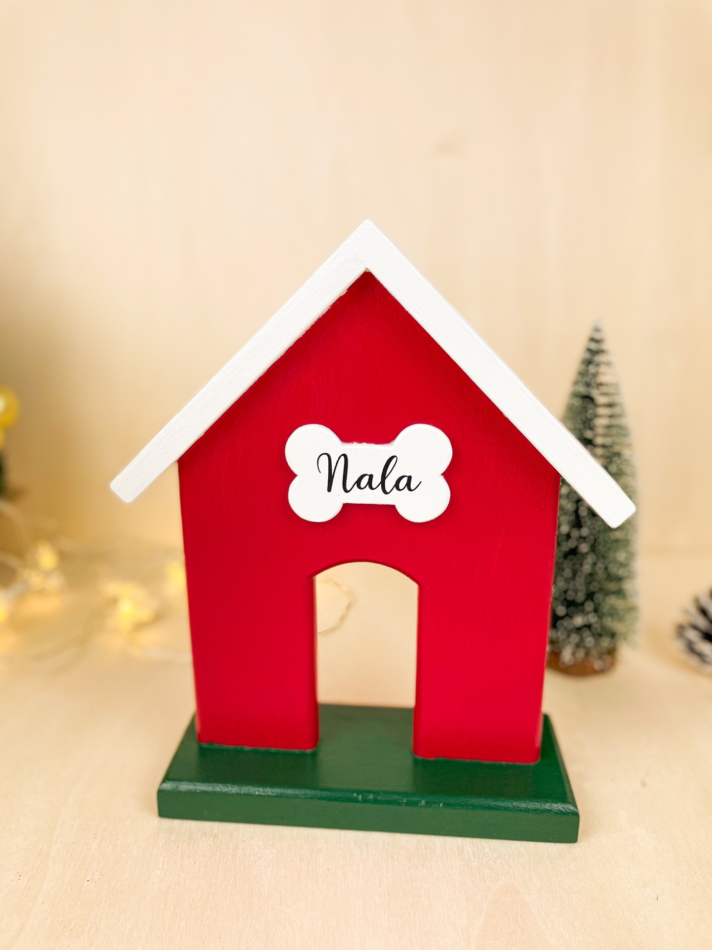 • Casa de madeira para cães vermelha com telhado branco e placa com nome Nala